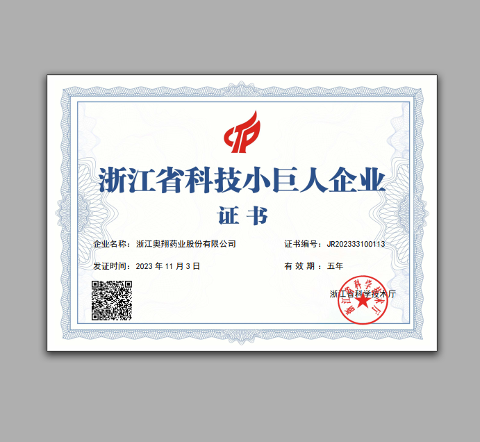 11月3日,浙江省科技厅发布了《2023年度浙江省科技小巨人企业名单》,奥翔药业被认定为2023年度浙江省科技小巨人企业。